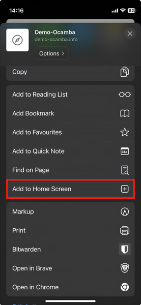Instruct users to add your website to their home screen by tapping the Share icon and selecting Add to Home Screen in order for the website to be located on their iOS home screen.