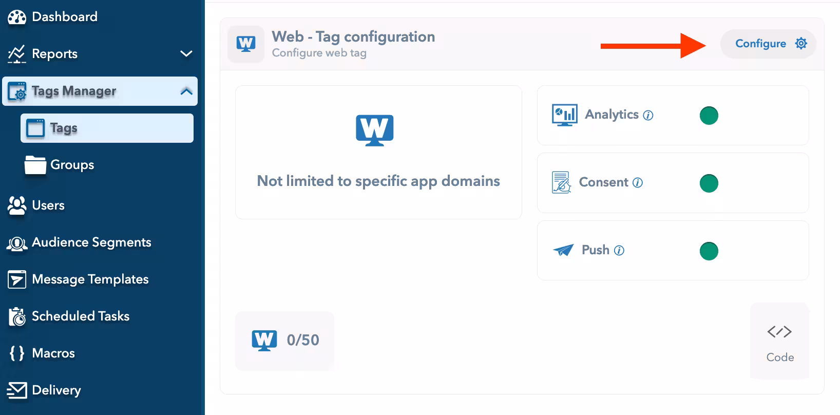 | Push allow | onPushAllow | Emitted when a visitor clicks on the Allow button of the notification prompt. |