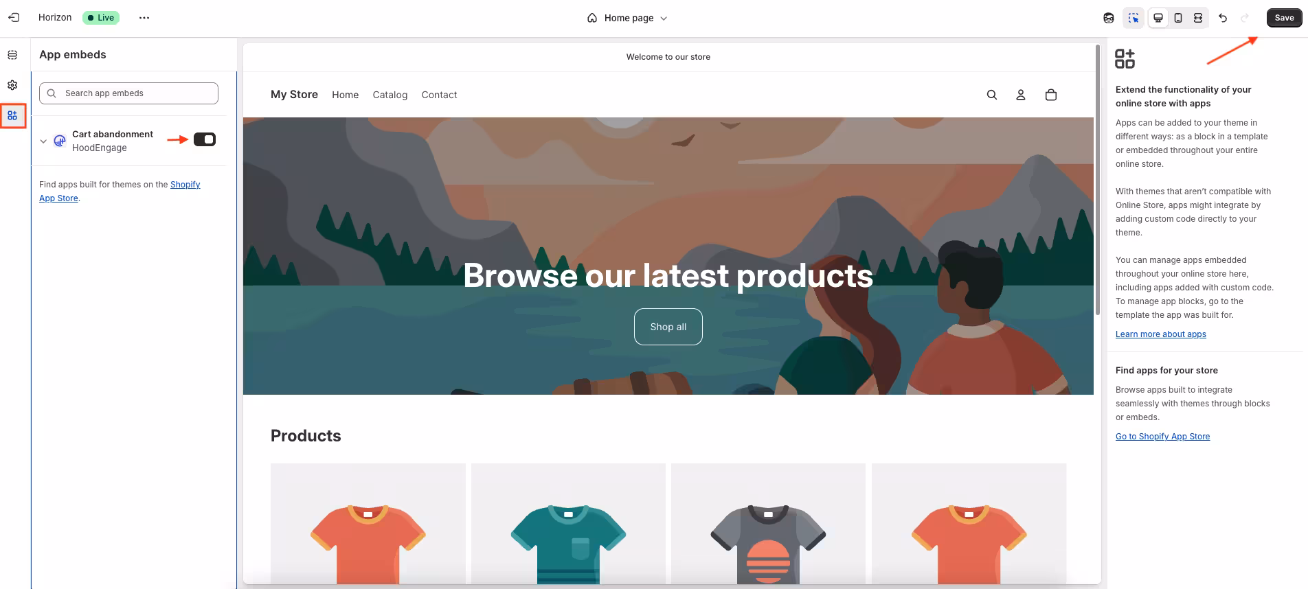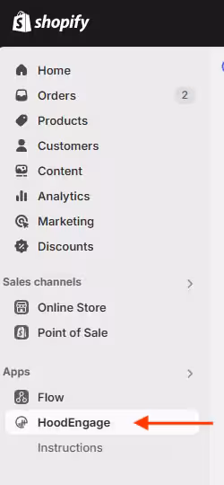 - After installation, open the HoodEngage app from your Shopify admin dashboard (sidebar).