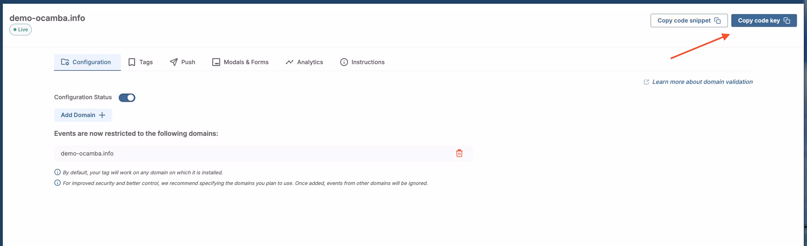 - Go back to HoodEngage app > Site setup or Configuration hub (Configuration). Open the web configuration, and click Copy code key.